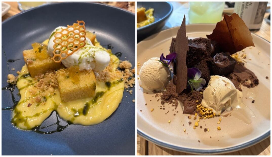 De la carta de postres te sugerimos pedir el Hani, un cremoso de limón amarillo, cake de miel con gelatina de miel, helado, crumble y cristalizado de jengibre; así como el Chokoreto, un pastel de chocolate deconstruido con un toque de ajonjolí caramelizado, y helado de caramelo y tahini.