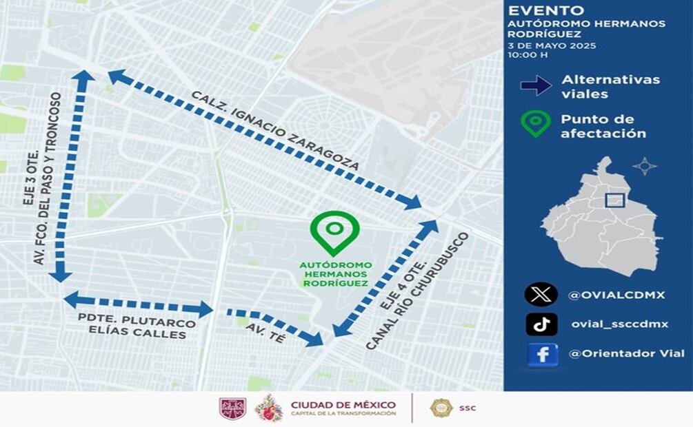 Se prevé afectación vehicular en inmediaciones del Autódromo Hermanos Rodríguez, por evento a las 10:00 horas. Consulta aquí Alternativa Vial