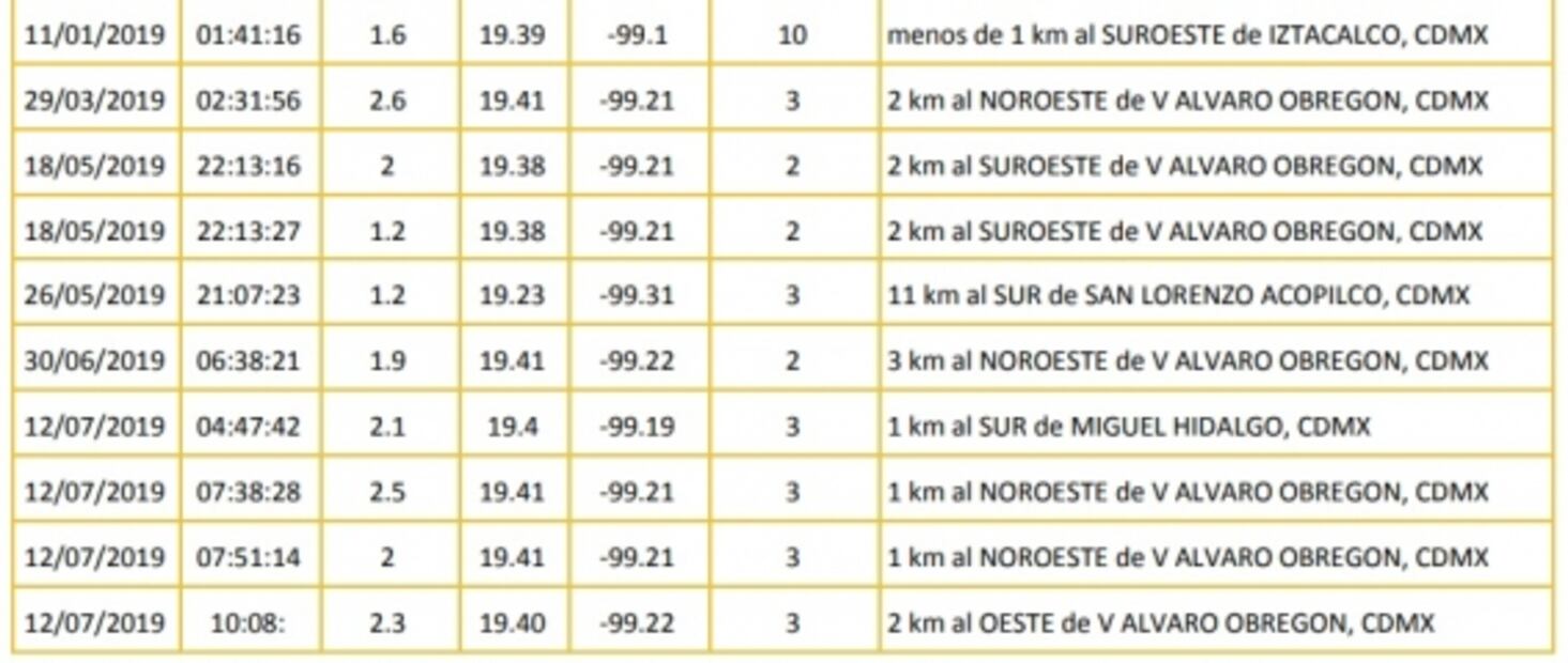 El Servicio Sismológico Nacional (SSN) indica en sus registros que 10 "micro" sismos con epicentro en la Ciudad de México han ocurrido durante el 2019. Siete de los cuales fueron en Álvaro Obregón.