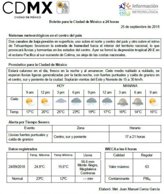 El organismo preció que se espera cielo medio nublado durante la mañana y nublado por la tarde con tormentas puntuales muy fuertes y actividad eléctrica en el Estado de México y lluvias puntuales fuertes en la Ciudad de México.