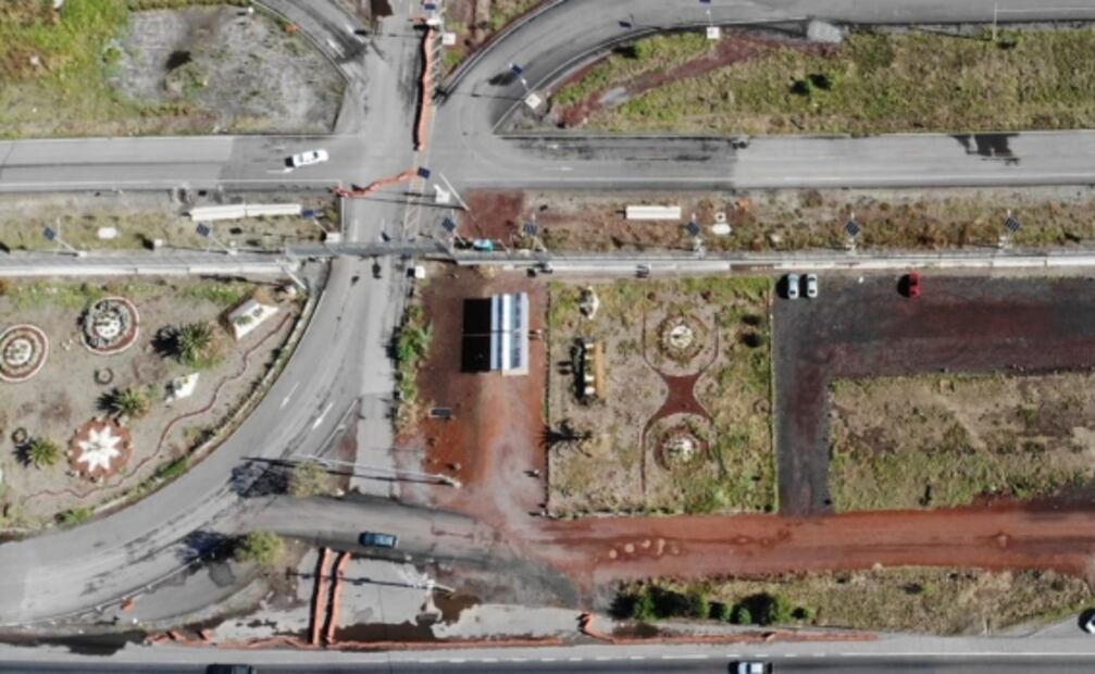Sobre el camellón que divide la carretera Peñón- Texcoco hay un pequeño campamento de obreros y algo parecido a un jardín-maqueta que asemeja la pista de NAIM.