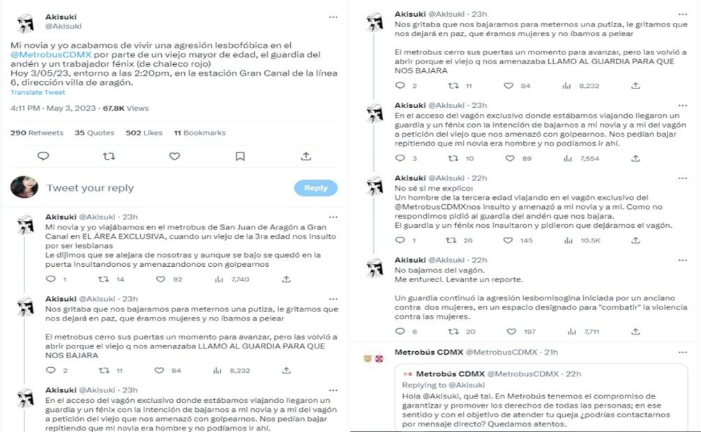 Por medio de redes sociales, una joven denunció que junto con su novia vivió un acto de intolerancia y discriminación por su orientación sexual derivada por un pasajero y autoridades de una unidad de Metrobús de la Ciudad de México.