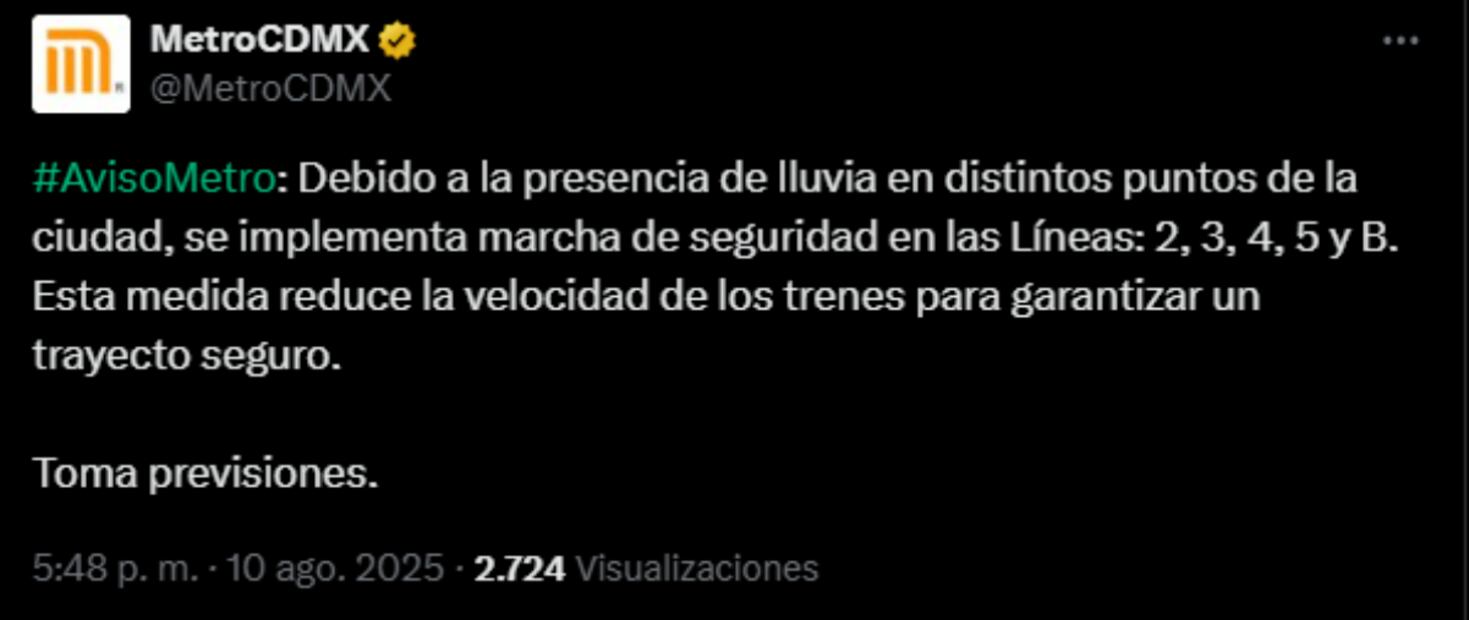 El Metro anunció que debido a la presencia de lluvia en distintas partes de la ciudad, se implementa marcha de seguridad en las Líneas 2, 3, 4, 5 y B.