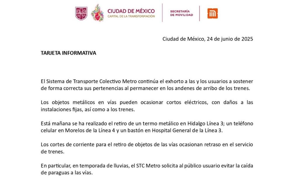En esta temporada de lluvias, el Sistema de Transporte Colectivo Metro exhortó a usuarios a sostener de forma correcta sus pertenencias al permanecer en los andenes de arribo de los trenes. Este martes retiró tres objetos que cayeron a las vía.