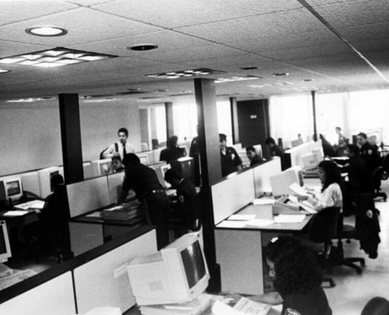 El manual afirma que, entre compañeros, cuando se toque el tema de vicios, malas costumbres o deformidades naturales, se debe cerciorar que no se encuentre presente alguien que pudiera sentirse mortificado por el comentario. En la foto se observan trabajadores en una sala de monitoreo de emergencias 060 en los años 90. Fotografía de El Universal.
