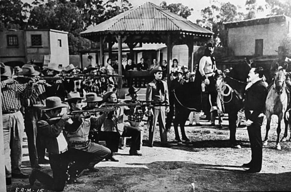 A caballo, el legendario luchador Rayo de Jalisco, durante el rodaje de una película. Archivo F. / EL UNIVERSAL.