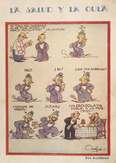 “La salud y la gula”, cartón de Audiffred publicado el 27 de diciembre de 1928 en El Universal Ilustrado.