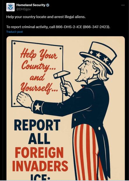 Para dar a conocer un número de teléfono en el que contactar a la policía de inmigración, el Departamento de Seguridad Interior (DHS) difundió el miércoles en la red X una imagen del Tío Sam.