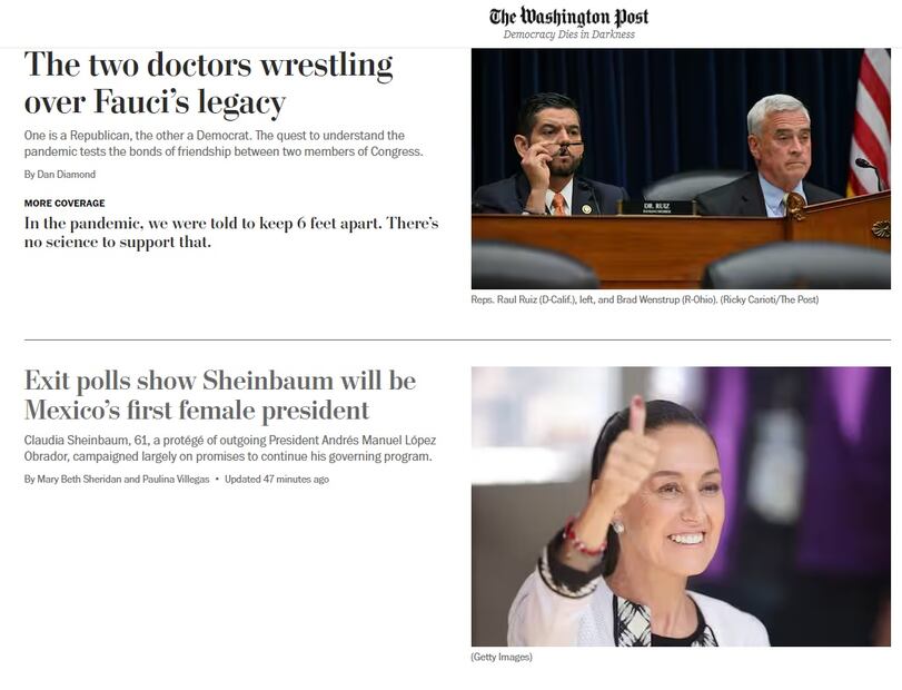 El diario estadounidense The Washington Post indicó en su portal que Sheinbaum, de 61 años, es la ganadora de acuerdo con sondeos a boca de urna, a la espera de que el INE dé a conocer resultados oficiales. "Sheinbaum, a punto de convertirse en la primera presidenta de México", señala el medio, que añade que "la histórica votación del domingo subrayó los avances de la nación en materia de igualdad de género, pero también puso de manifiesto la preocupación por el debilitamiento de sus instituciones democráticas".