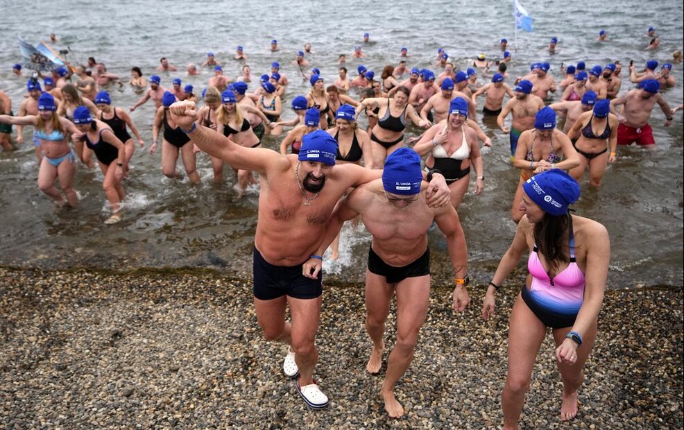 Un grupo de personas celebran después de zambullirse en las aguas heladas del lago Most en la República Checa, el 1 de marzo del 2025. Foto: AP