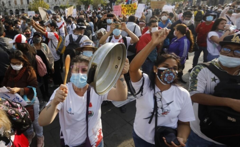 "Que se vayan todos los corruptos", arengaron los participantes mientras portaban banderas peruanas y pancartas, así como mascarillas y protectores faciales para cuidarse del Covid-19 , que ha dejado en el país más de 928 mil casos y 35 mil fallecidos.