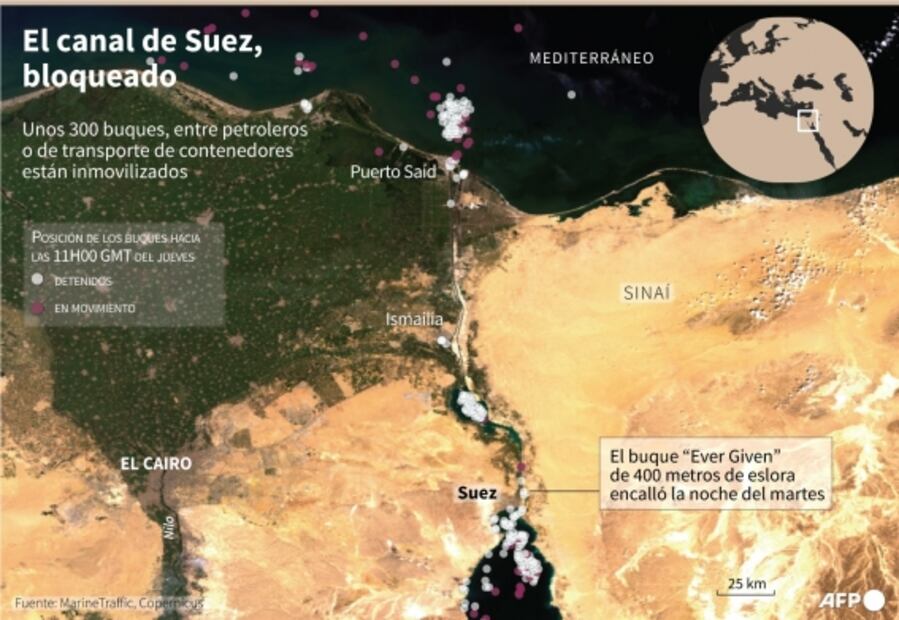 El canal de Suez , que conecta el mar Rojo con el Mediterráneo, se encuentra bloqueado desde que el martes un gran portacontenedores encallara en el tramo sur de este paso artificial, uno de los más importantes para el transporte marítimo y para el petróleo procedente del golfo Pérsico.