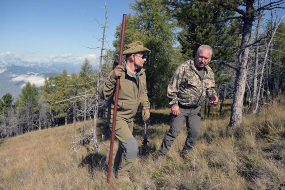 , ataviado con ropa, botas y gorro de camuflaje , aparece haciendo senderismo , recogiendo setas, posando para los fotógrafos y admirando el paisaje y los cañones por los que serpentea el Yenisei , el quinto río más largo del planeta.
