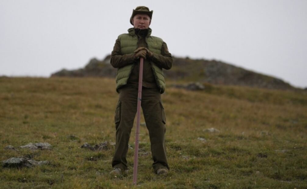 El Kremlin divulgó un video donde se ve a Putin el domingo ascendiendo con la ayuda de un bastón de madera por unas escarpadas colinas cerca del río Yenisei (república de Tuva, limítrofe con Mongolia).