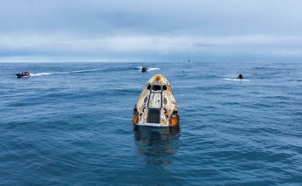 Una transmisión en directo mostró cómo una cápsula Crew Dragon de SpaceX llamada "Freedom" descendía flotando en paracaídas hasta el océano Atlántico, donde fue interceptada y llevada a bordo de un barco de recuperación.
