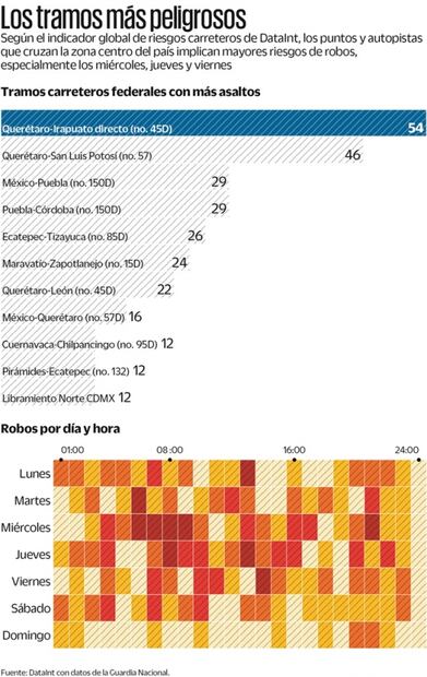 Con respecto a los días y horarios en los que más se concentran los robos en las carreteras, destacan los miércoles, jueves y viernes en los periodos que van de las siete a las 10 de la mañana, de la una a las dos de la tarde y, por la noche, de ocho a 10. El punto de más robos en el semestre fueron los miércoles de 6 a 10 de la mañana.