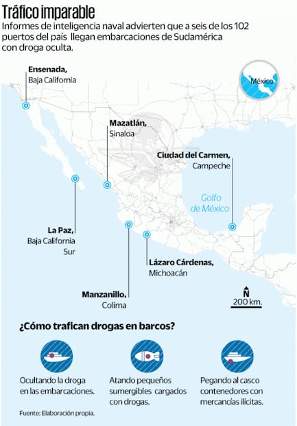 Los cárteles del narcotráfico concentran sus operaciones de trasiego de droga en seis puertos del país, cinco del Pacífico y uno del golfo de México, a donde llegan embarcaciones procedentes de Centro y Sudamérica , con carga oculta de diferentes formas.