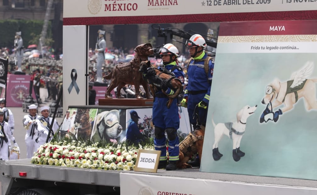 11:58 am Desfila el equipo canino de búsqueda y rescate, de la Semar, recordando a la ''perrita'' Frida.