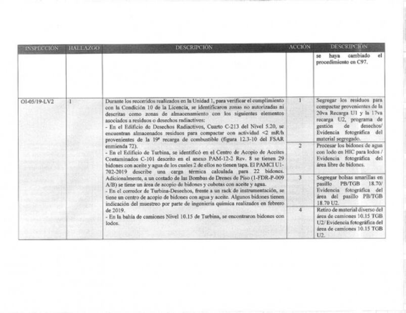 En concreto, la evaluación EIS-LV2-01/2020 alude a una inobservancia a la ley reglamentaria del artículo 27 constitucional, al Reglamento General de Seguridad Radiológica, a la condición 10 de la licencia original de operación y al Plan de Garantía de la Calidad, pues halló 11 sitios con residuos en la U1 y 10 en la U2 desde al menos 2019.