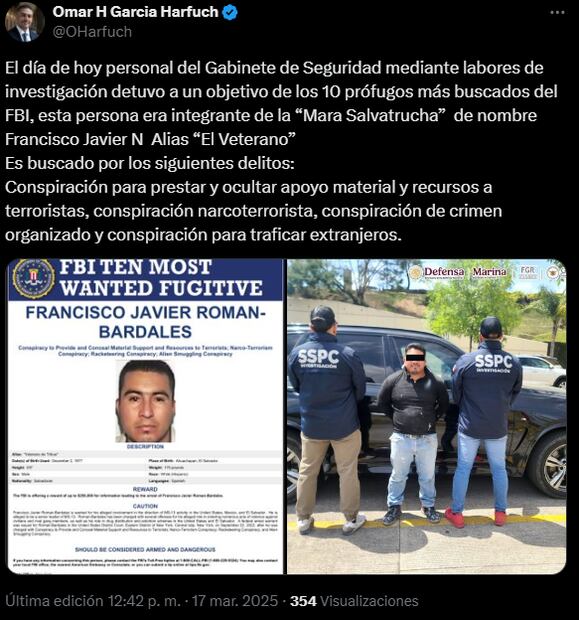 Mediante su perfil de X, el titular de la SSPC anunció que este lunes 17 de marzo personal del Gabinete de Seguridad, integrado por la Secretaría de la Defensa Nacional (Defensa), Secretaría de Marina (Semar), Fiscalía General de la República (FGR), Guardia Nacional (GN) y Secretaría de Seguridad y Protección Ciudadana (SSPC), mediante labores de investigación, detuvo a Francisco Javier "N", alias “El Veterano”.