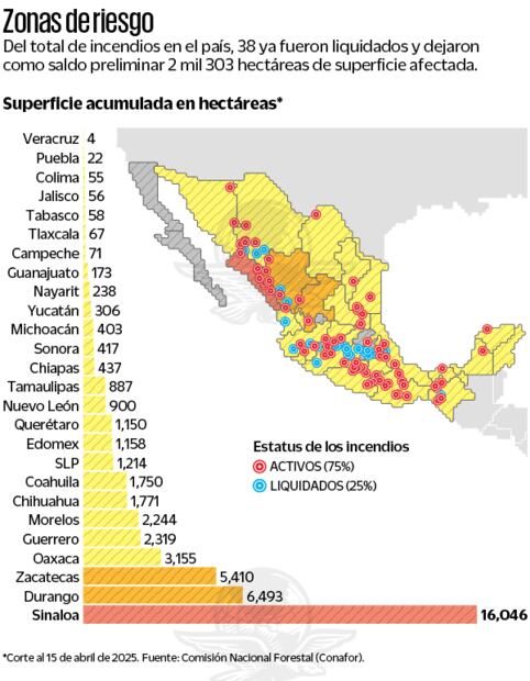 El siniestro con más superficie preliminar afectada sigue activo en San Ignacio, Sinaloa, desde el 8 de abril, con 10 mil 230 hectáreas en llamas. De acuerdo con información del reporte diario, el segundo incendio más grande se encuentra en Tepechitlán, Zacatecas, con 5 mil 200 hectáreas.