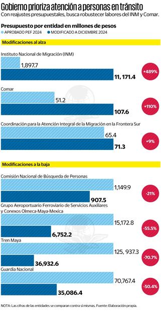 En contraste, a diciembre del año pasado se observó un castigo presupuestal a programas para buscar personas desaparecidas, recortes al grupo aeroportuario que construyó el Aeropuerto Internacional Felipe Ángeles (AIFA), disminuciones al Tren Maya y reducciones a la Guardia Nacional, que ahora se encuentra adscrita a la Secretaría de la Defensa Nacional (Defensa).