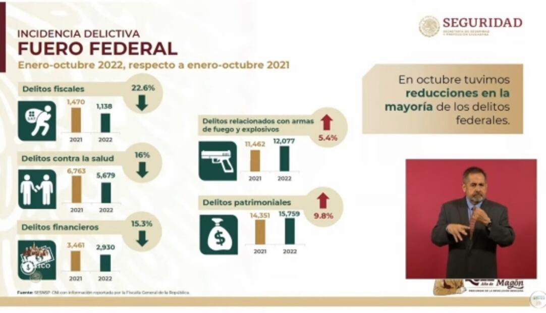 07:41- Rosa Icela Rodríguez , secretaria de Seguridad y Protección Ciudadana, afirma ante López Obrador que hay una reducción en la mayoría de los delitos federales. Sobre el homicidio doloso admite un “leve repunte” en octubre, pero una disminución en lo que va de noviembre.