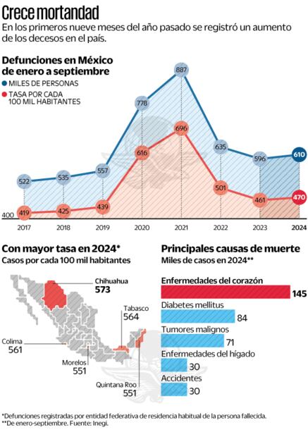 Por el contrario, los estados que reportaron las tasas más bajas fueron Sinaloa, con 389 casos; Guerrero, 393; Tlaxcala, 399; Hidalgo, 412, y Nayarit, con 422 defunciones por cada 100 mil habitantes en el periodo de referencia.