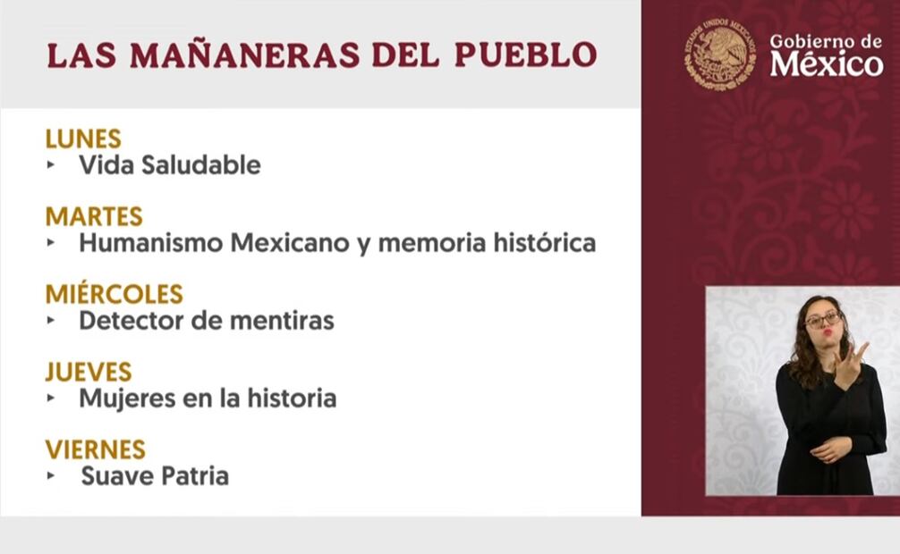 07:44- Claudia Sheinbaum presenta las "secciones" que abordará durante sus conferencias matutinas: lunes, Vida Saludable; martes, Humanismo Mexicano y Memoria Histórica; miércoles, Detector de Mentiras; jueves, Mujeres en la Historia y viernes, Suave Patria.