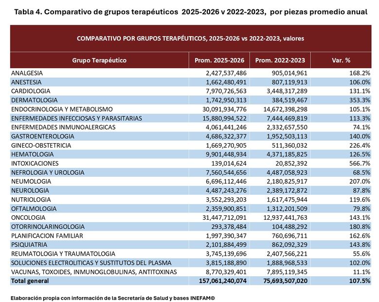 La tabla 4 muestra el comparativo entre el bienio 2025-2026 respecto a 2022-2023. El total de piezas a convocar es 65% mayor respecto al promedio del bienio citado, algunos grupos podrían crecer más de 100% e incluso, como el caso de planificación familiar, supere el 200%. En el caso de vacunas, este grupo podría crecer más del 70%.