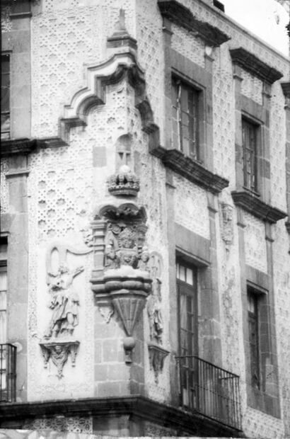 La llamada Casa de las Ajaracas alrededor de 1930, situada en la esquina de las calles República Argentina y República de Guatemala, antes llamadas Escalerillas y Rélox. La historia de esta construcción se remonta al siglo XVI con modificaciones en el XVIII y perteneció al mayorazgo Nava Chávez; hoy sólo se conserva la parte del fondo que alberga al Museo Archivo de la Fotografía. Colección Carlos Villasana.