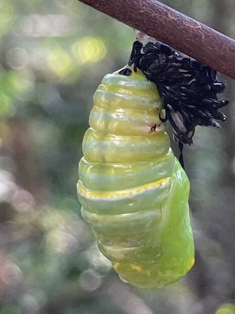 El 30 de septiembre nacieron las primeras orugas –como tornillos tricolores de menos de 1 cm que comían sin parar, defecaban pequeños polígonos rugosos color caoba y se contoneaban constantemente por los algodoncillos. Por lo menos 15 especies de mariposas y polillas** las acompañaron durante su desarrollo en la terraza, pues el algodoncillo es una fuente rica de néctar para muchos polinizadores.