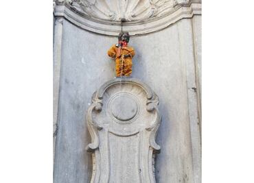 Con ese atuendo, la icónica escultura de Bruselas festejó el 206 aniversario de la independencia de México