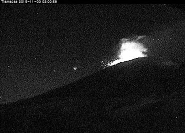 Incandescent fragments over the crater were observed at night