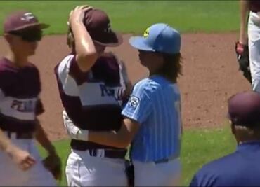 Isaiah Jarvis, de Oklahoma, fue hasta la lomita para abrazar al pitcher Kaiden Shelton, quien estaba en shock debido a su error