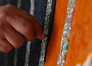 Indígenas originarios del poblado de San Sebastián, en la sierra norte de Jalisco, trabajan durante 14 horas en las 32 piezas que conforman el colorido mosaico hecho completamente a mano. Mide 81 metros cuadrados y pesa casi dos toneladas