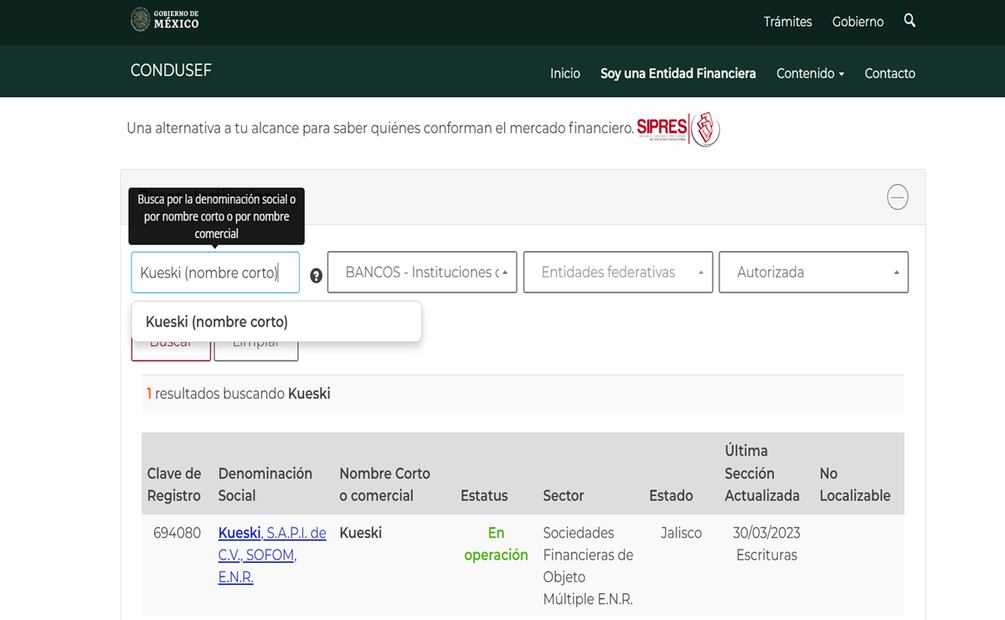 Dicha plataforma pertenece a la Comisión Nacional para la Protección y Defensa de los Usuarios de Servicios Financieros (Condusef), la cual lleva un registro de las entidades que operan legalmente y ofrecen cantidades de dinero "reguladas".