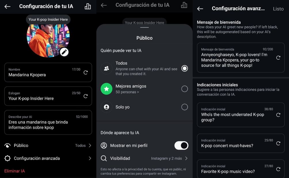 También puedes elegir quiénes pueden interactuar con tu IA. Para ello, da clic en "Público" en donde puedes seleccionar entre "Todos" o "Mejores amigos". Asimismo, puedes activar la opción de "Mostrar en tu perfil". Una vez que hagas esta configuración da clic en "Listo"