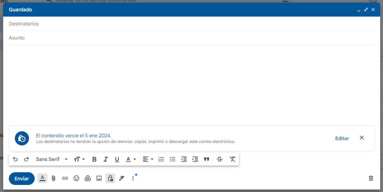 De igual forma, puedes establecer una fecha de vencimiento del mensaje. Después de que caduque, los demás no podrán verlo. También es posible solicitar una contraseña por SMS para que los destinatarios accedan al correo.