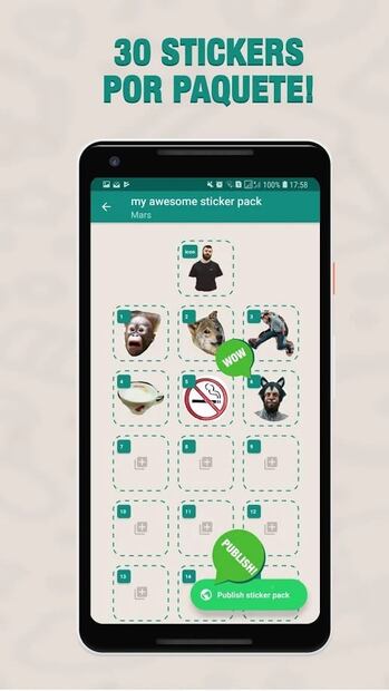 Para hacer esto último, hay que abrir la app WSTick y dar clic en el signo de suma que aparece en la parte superior derecha de la pantalla. Tras introducir un nombre a la carpeta y un autor, hay que añadir las cuatro imágenes. Una vez realizados todos estos pasos, los stickers ya estarán listos en whatsapp para que el usuario pueda utilizarlos en cualquier conversación .Top Stickers te ofrece además, otras colecciones hechos por usuarios al azar.
