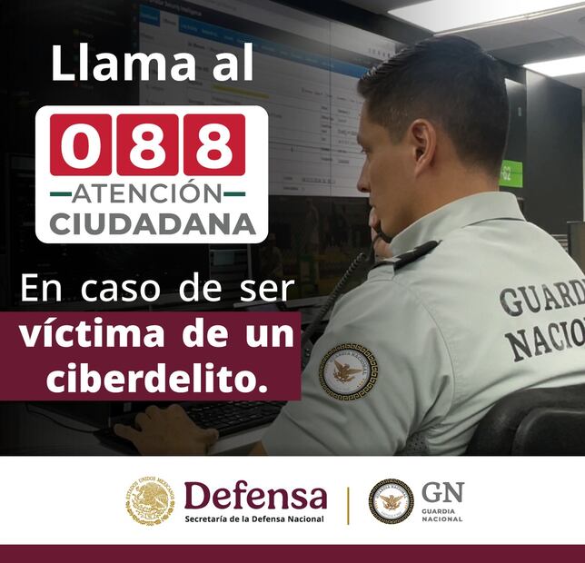 En caso de ser víctima de algún ciberdelito, contacta a la Guardia Nacional al número de atención ciudadana 088, donde te brindarán orientación para presentar tu denuncia.