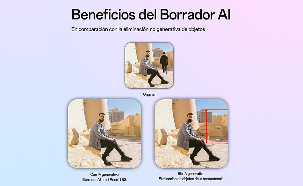 Pero, con el Borrador AI para OPPO Reno11 5G, la calidad de la foto no se ve comprometida. Este permite que los usuarios tengan una mejor posibilidad de retirar objetos de forma precisa, haciendo que el producto final esté acorde a la composición deseada.