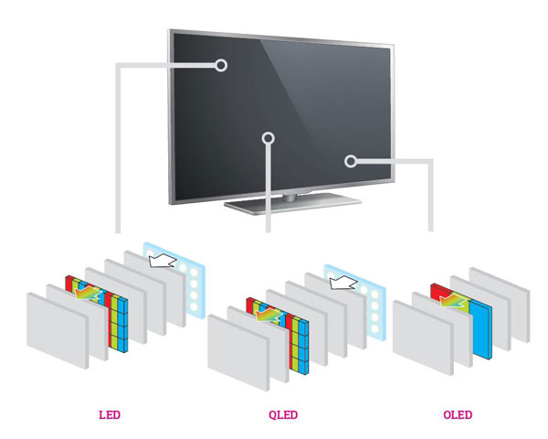 Las pantallas QLED se iluminan con LED a lo largo de su borde y tienen una función parecida a la LCD con retroalimentación LED de borde. La principal característica de esta tecnología es que utiliza un filtro de color de punto cuántico el cual permite obtener un mejor brillo que el que ofrecen las pantallas OLED , además que sus colores son más llamativos y los tiempos de respuesta son menores.