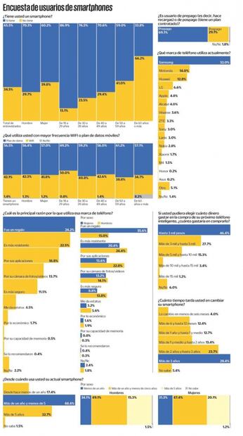 Alrededor de uno de cada dos mexicanos que utilizan teléfonos inteligentes en nuestro país no destinaría más de tres mil pesos para la compra de su próximo dispositivo de este tipo, reveló la primera “Encuesta nacional de hábitos de usuarios de teléfonos inteligentes en México de EL UNIVERSAL”.
