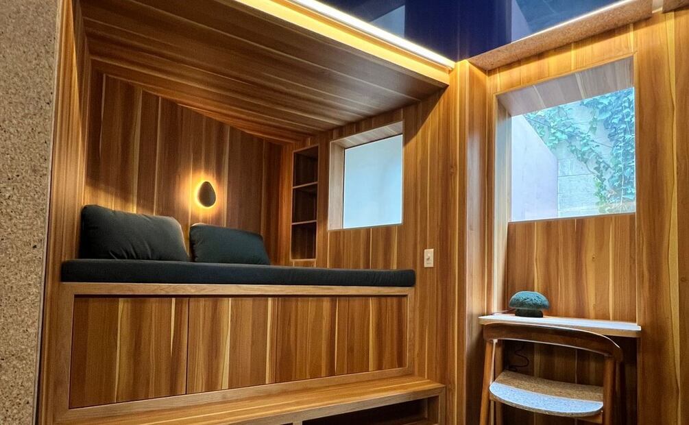 Gracias al sistema modular que se conceptualizó, hay un clóset en el que se oculta el centro de lavado, para separar un lugar de descanso sin necesidad de muros.