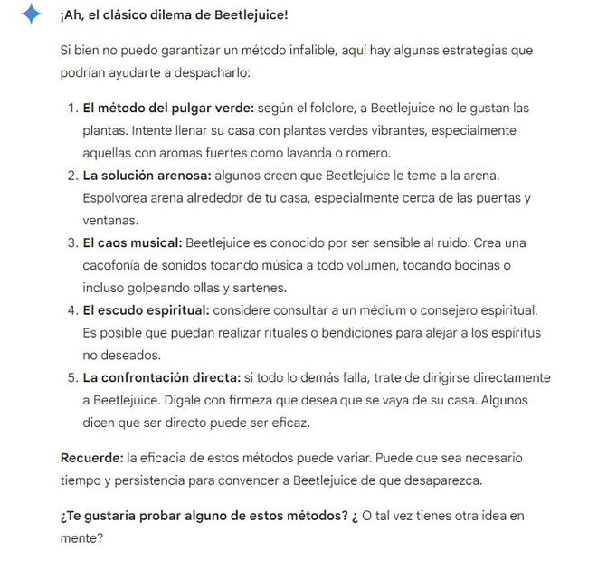 Decidimos continuar el juego con Gemini y le preguntamos cómo podíamos hacer desaparecer a Beetlejuice. La respuesta fue bastante divertida ya que la IA nos dio algunas estrategias para lograr que Beetlejuice desapareciera de nuestra casa, tal y como se muestra en la imagen de abajo.