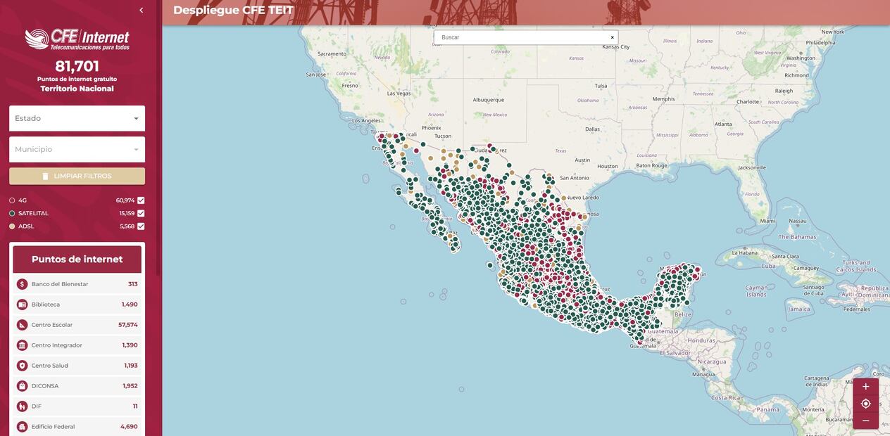 Primero deberás entrar al enlace https://mapa.internetparatodos.cfe.mx/?entidad=&municipio=&t4g=true&tsatelital=true&tadsl=true, luego selecciona tu estado y municipio. También tienes la opción de filtrar las búsquedas por 4G, satelital o fibra óptica.