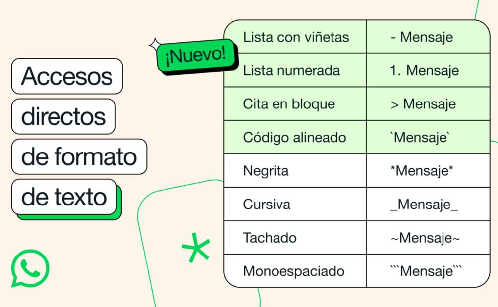 Estos formatos de texto, se unen a otros que anteriormente ya estaban disponibles en la aplicación. Pero si no los conocías, a continuación te los enlistamos: