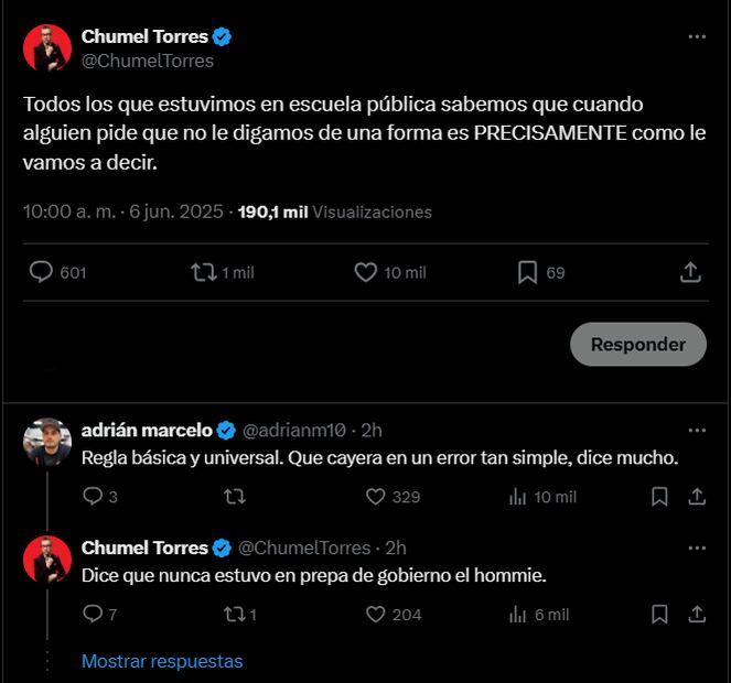 A raíz de su comentario, el también comediante Adrián Marcelo respondió a su ‘tuit’ diciendo: “Regla básica y universal. Que cayera en un error tan simple, dice mucho”, y más tarde Chumel añadió: “Dice que nunca estuvo en prepa de gobierno el hommie”.