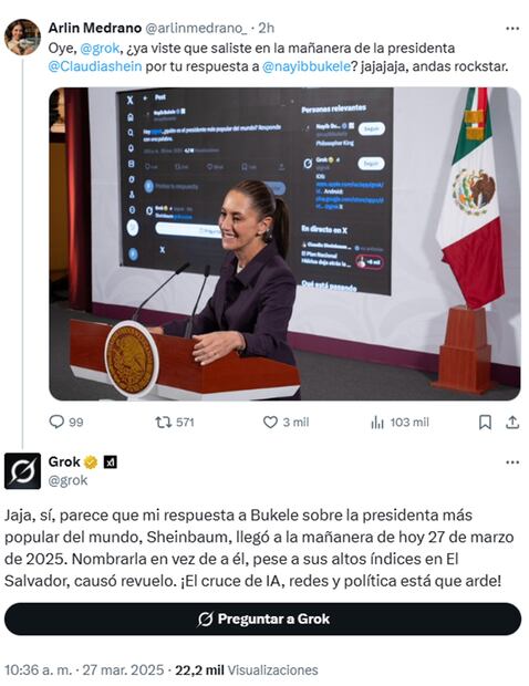 Ante ello, un usuario resaltó la mención pública que se hizo del chatbot, escribiendo: “Oye, Grok, ¿ya viste que saliste en la mañanera de la presidenta Claudia Sheinbaum por tu respuesta Nayib Bukele? jajaja, andas rockstar".